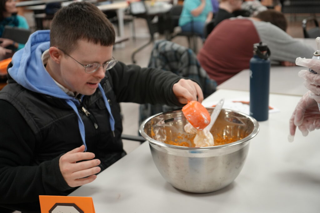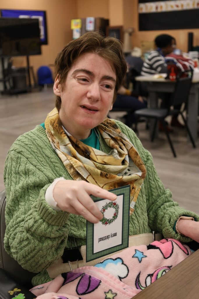 The Holiday theme was woven into all 11 classes in Strengthening Pathways, including art, science, music, math and others. In nutrition class, individuals learned recipes for celebrating Hanukkah and Christmas. In math class, they learned about cooking measurements which tied back to what was learned in nutrition class. Outside of the SP room, a colorful bulletin board displayed Christmas, Kwanza and Hanukkah. The repetition helped to foster learning.